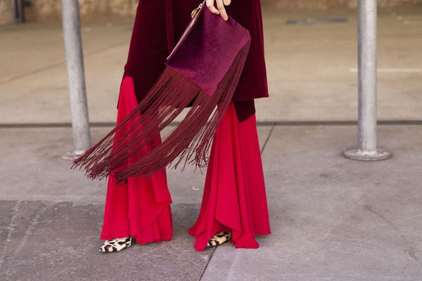 Efeito degradê, com Grenadine e Tawny Port. Como as cores são da mesma família, vale apostar em acessórios diferenciados para dar ainda mais personalidade ao look, como o calçado com estampa de oncinha. Foto: Merilyn Smith/WireImage
